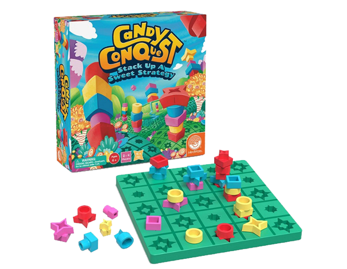 - A twist on traditional in-a-row games, Candy Conquest challenges players to strategically stack their vibrant shapes on the board while outmaneuvering opponents.